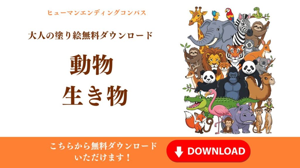 ヒューマンエンディングコンパスで全素材無料PDFダウンロード。A4・拡大版対応で印刷簡単、デジタル彩色もOKです。人気の動物・生き物を厳選まとめました。これらを終活ノートに活用。パンダ塗りで「子育ての喜び」をメモするなど、自己史と連動。